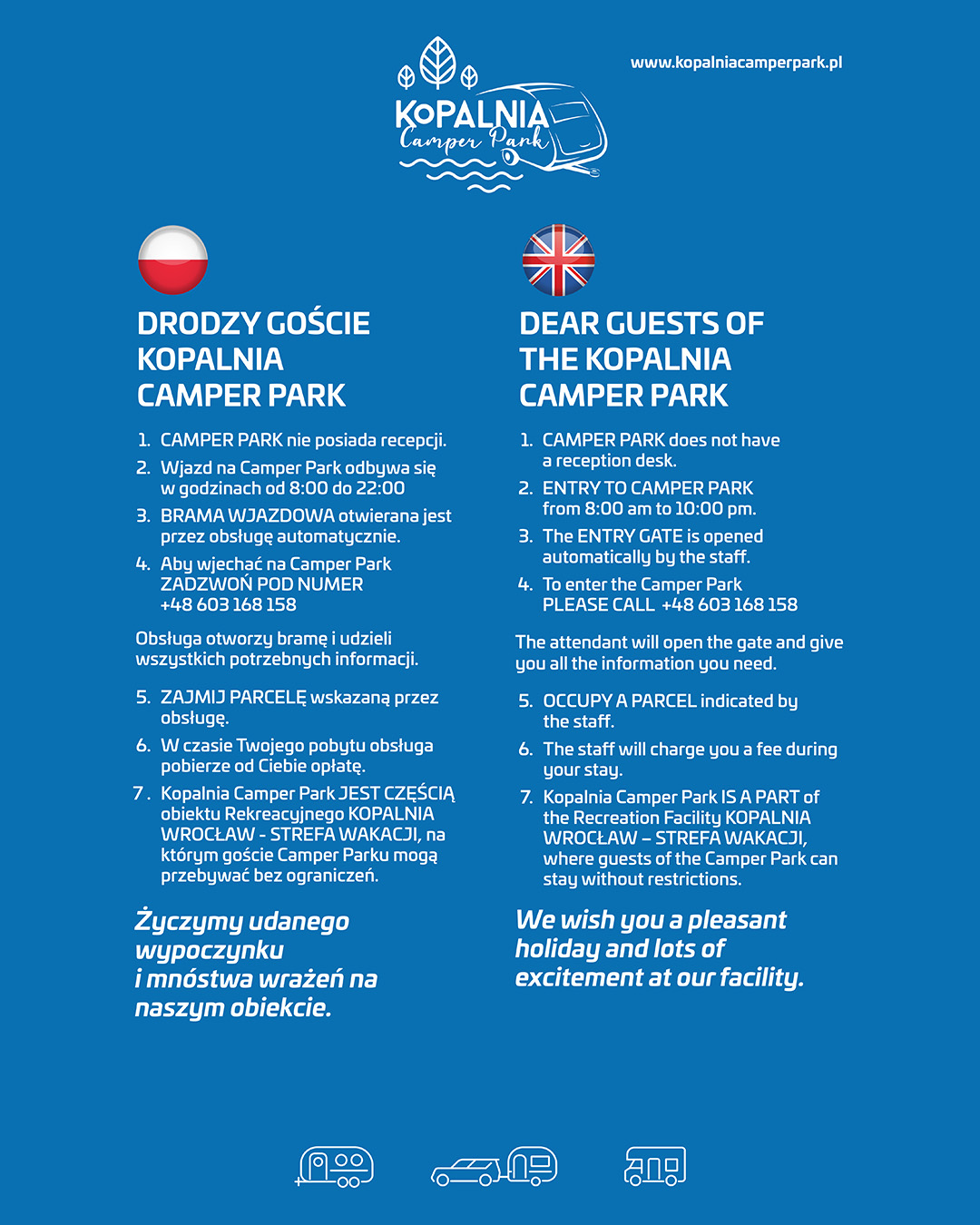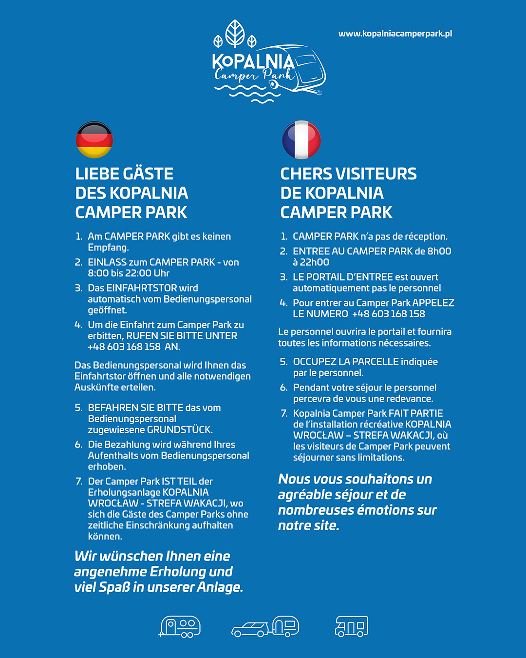 Na granicy z Wrocławiem, przy ujściu Widawy do Odry, w otulinie lasów i obszaru Natura 2000, na terenie obiektu rekreacyjnego Kopalnia Wrocław – Strefa Wakacji, znajduje się najpiękniej położony w okolicach Wrocławia całoroczny KOPALNIA CAMPER PARK. To najlepsza baza wypadowa do zwiedzania stolicy Dolnego Śląska, oferująca jednocześnie kontakt z naturą, ciszę, spokój i relaks nad pięknym, zarybionym zbiornikiem wodnym z krystalicznie czystą wodą. Znajdziecie tu również duże plaże, boiska, altany, grille, duży plac zabaw, slip, wypożyczalnię kajaków i desek SUP oraz wspaniały dmuchany park wodny.
